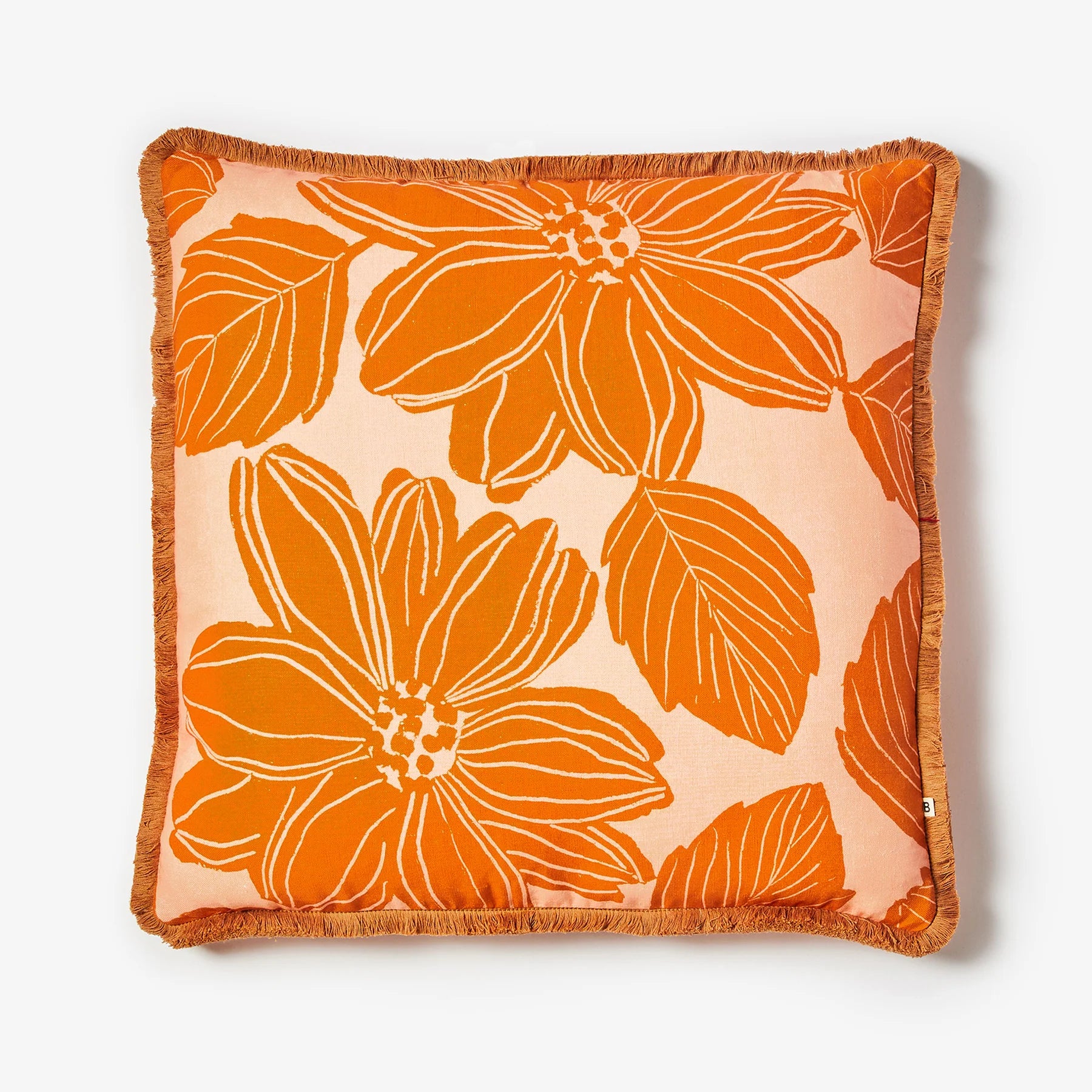 With its carved wood block appearance, the design for our Margot Tan Cushion takes its inspiration from traditional woodcutting and printmaking techniques. Featuring oversized flowers and leaves in a warm two-toned palette, this tan and peach floral cushion pairs beautifully with bold patterns and vibrant stripes.