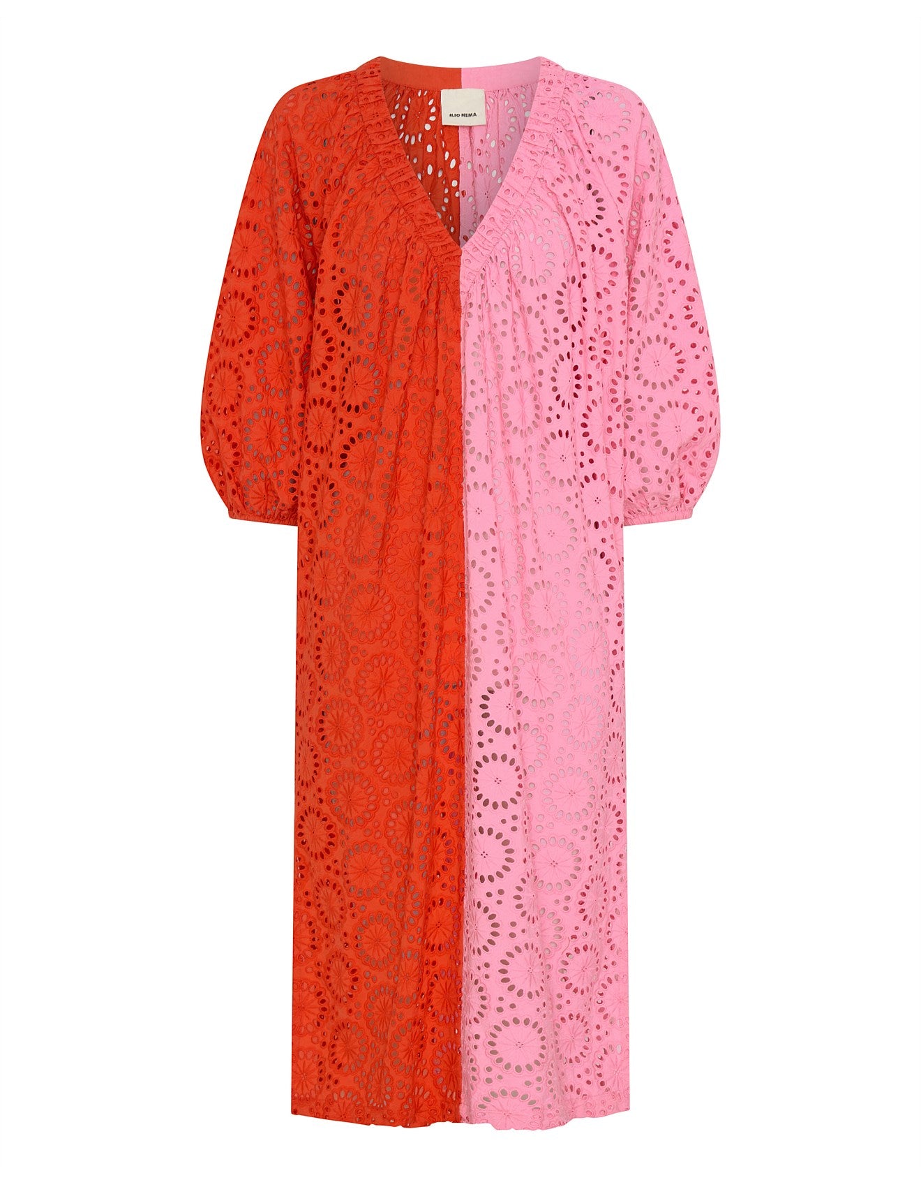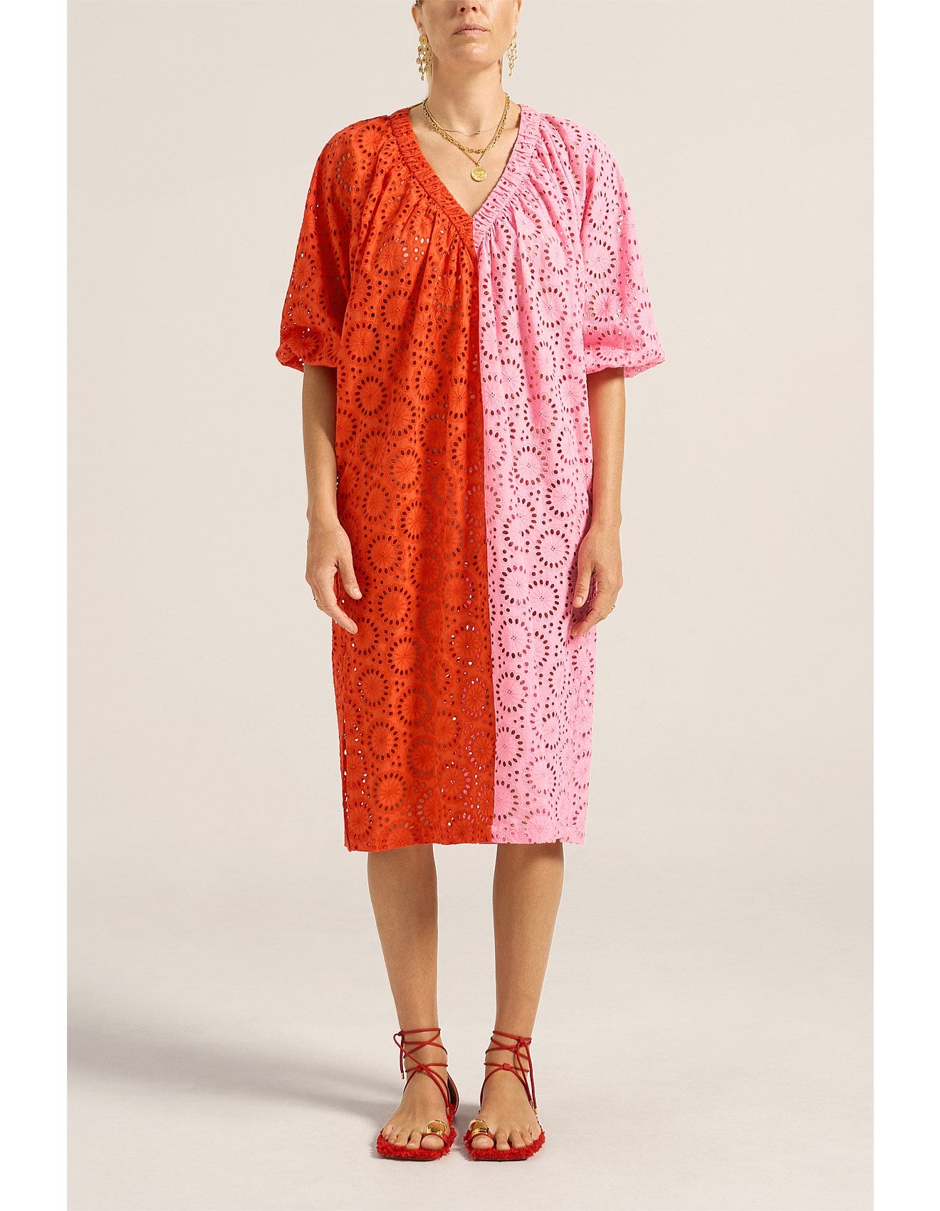 Vibrant and full of movement, the Atli Dress celebrates contrast through its playful dual tones of pink and red. Crafted from an airy cotton eyelet, the fabric is split down the centre—one side pink, the other red—creating a striking visual harmony that feels both bold and feminine. Designed with a relaxed, free-flowing silhouette, the dress features softly voluminous sleeves gathered with elastic cuffs, and a gentle V-neckline that flatters the décolletage. The mid-length hem drapes with ease, offering a sense of effortless grace with every step. Finished with a split lining that ensures coverage while maintaining the lightness of the openwork fabric, the Atli Dress is an expression of joyful balance—vivid, textural, and made for sunlit days.