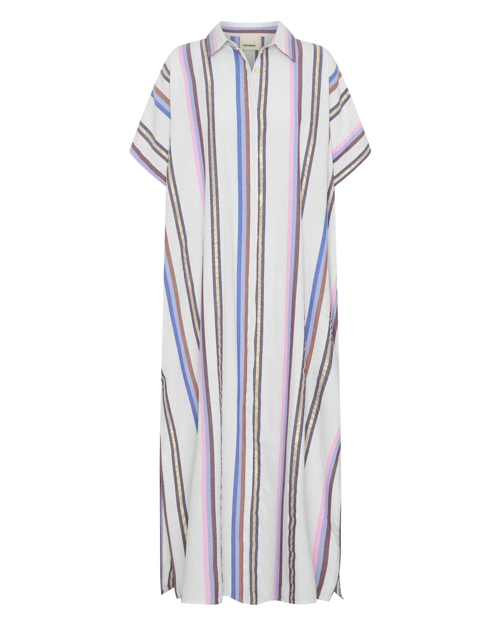 The Apollo Caftan is crafted from our exclusive 100% cotton Thessa Stripe. This luminous fabric features a crisp white base woven with stripes in blue, lavender, pink, brown and gold, a sophisticated colour palette that captures the warmth of sun-drenched days and balmy evenings. The relaxed, oversized silhouette is designed for easy, elegant living. A classic collared neckline and short sleeves offer timeless appeal, while the full button-front closure with gleaming gold buttons adds effortless styling versatility. The side slits create beautiful movement, the side seam pockets add to its functionnality. Wear the Apollo Caftan buttoned up as a breezy dress for relaxed sophistication, or style it open over the Remus Shorts as a chic layering piece.