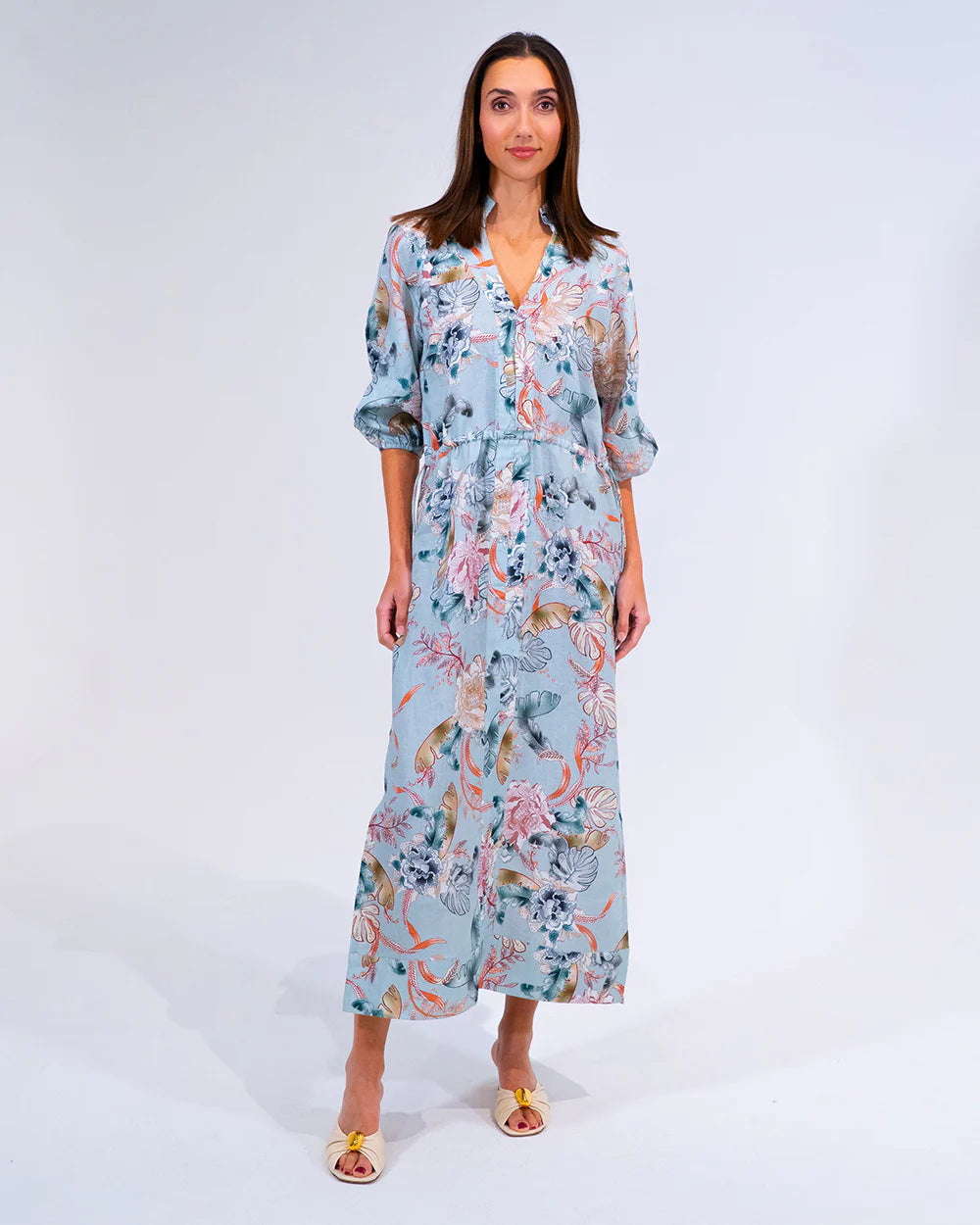 The Cassandra Dress is effortlessly elegant and super versatile. This pop-over style has a deep V-neck with button closure so you can wear it open or modest. Raglan sleeves with gentle gathers and elastic cuffs add soft volume. Drawcord waist lets you cinch or go relaxed. High side splits and wide hem bands create graceful movement, while the stand-up collar adds polish. Perfect for casual days or dressed-up evenings.