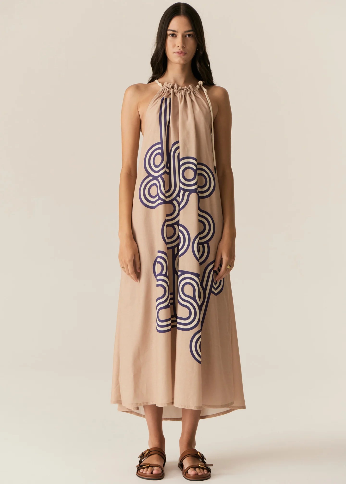 The Alter Tie Dress features our beautiful exclusive print in its full scale in pebble and blue.