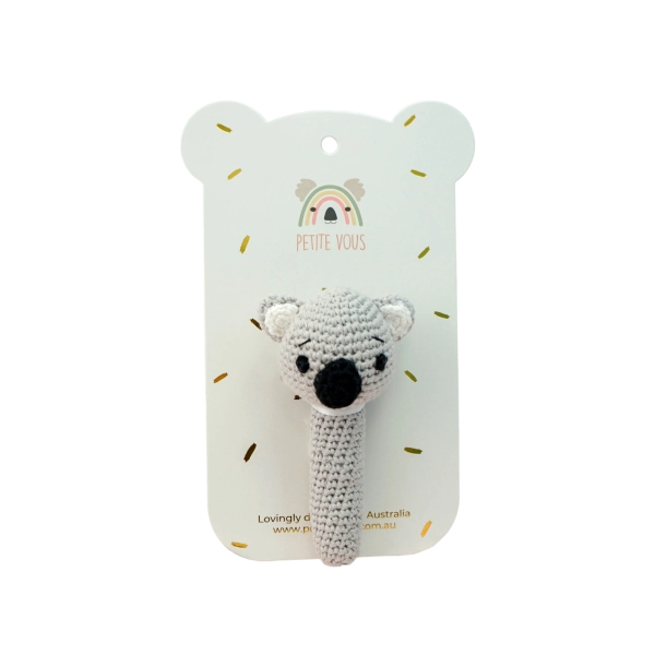 Our beautiful Petite Vous crochet hand rattle in the cute Kali Koala design is lovingly handmade using 100% cotton yarn and attached to a baby safe, beechwood teething ring. Features are embroidered making it safe for baby. Presented on our luxe Petite Vous branded backing card, this is perfect for hang sell merchandising and it makes the perfect gift for baby showers, newborns or hampers.