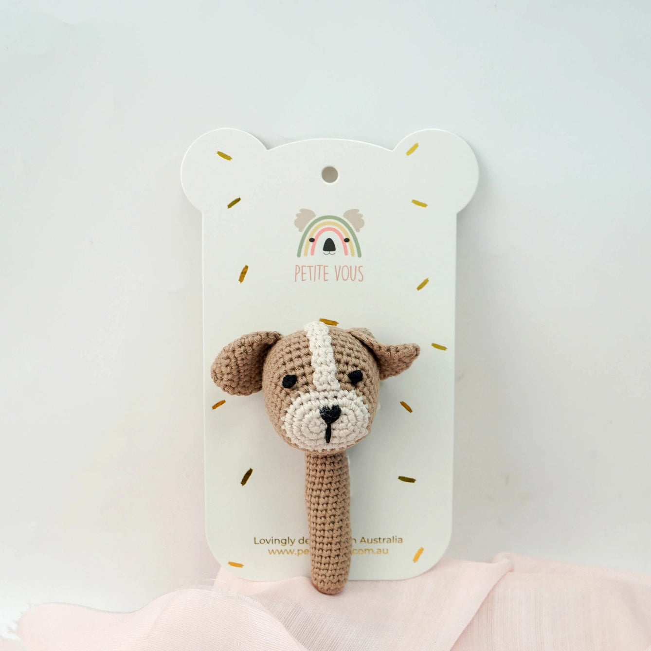 Our beautiful Petite Vous crochet hand rattle in the cute Parker Puppy design is lovingly handmade using 100% cotton yarn and attached to a baby safe, beechwood teething ring. Features are embroidered making it safe for baby. Presented on our luxe Petite Vous branded backing card, this is perfect for hang sell merchandising and it makes the perfect gift for baby showers, newborns or hampers.