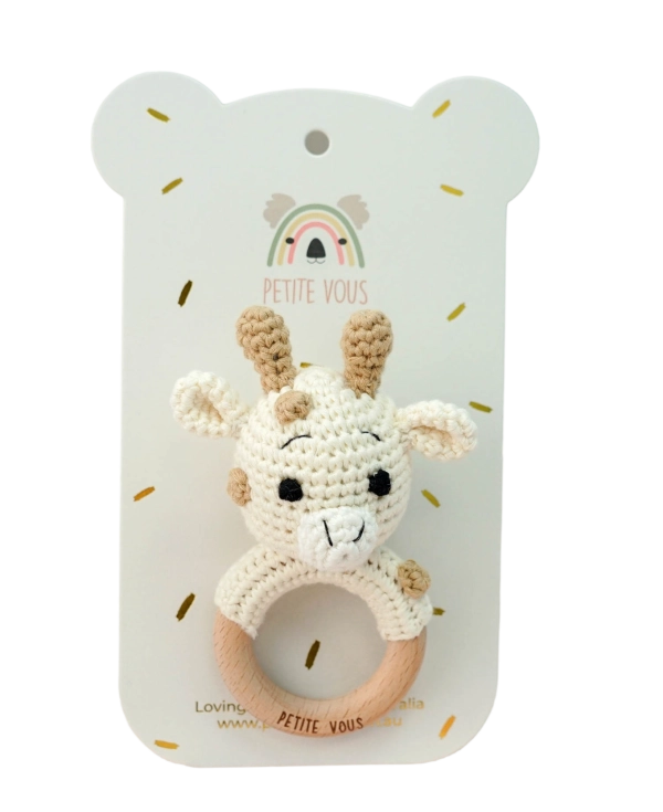 Our beautiful Petite Vous crochet ring rattle in the cute Percy Giraffe design is lovingly handmade using 100% cotton yarn and attached to a baby safe, beechwood teething ring. Features are embroidered making it safe for baby. Presented on our luxe Petite Vous branded backing card, this is perfect for hang sell merchandising and it makes the perfect gift for baby showers, newborns or hampers.