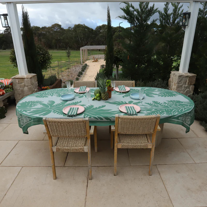 Elm, a duotone motif of summer palms peeking through a window. Bordered with a simple floral design in a cool mix of green and seafoam hues.The core ingredient of any great table setting. Intended to mix and match, designed to be paired back with summer napkins and staple crockery from the home.