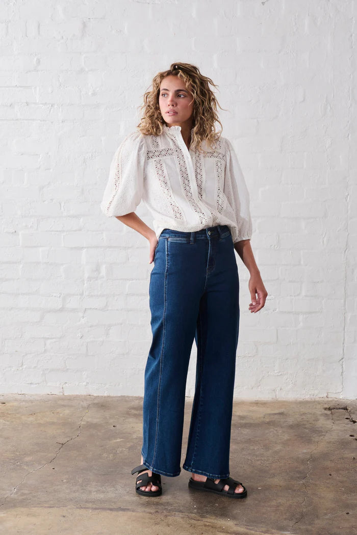 The Palazzo Jean takes the wide leg jean to a whole new level. This super-comfortable jean features an additional side panel that adds sophisticated structure and high set welt front pockets for a clean front. Looks great dressed up with a jacket and boots or casually with a comfy tee and bare feet.