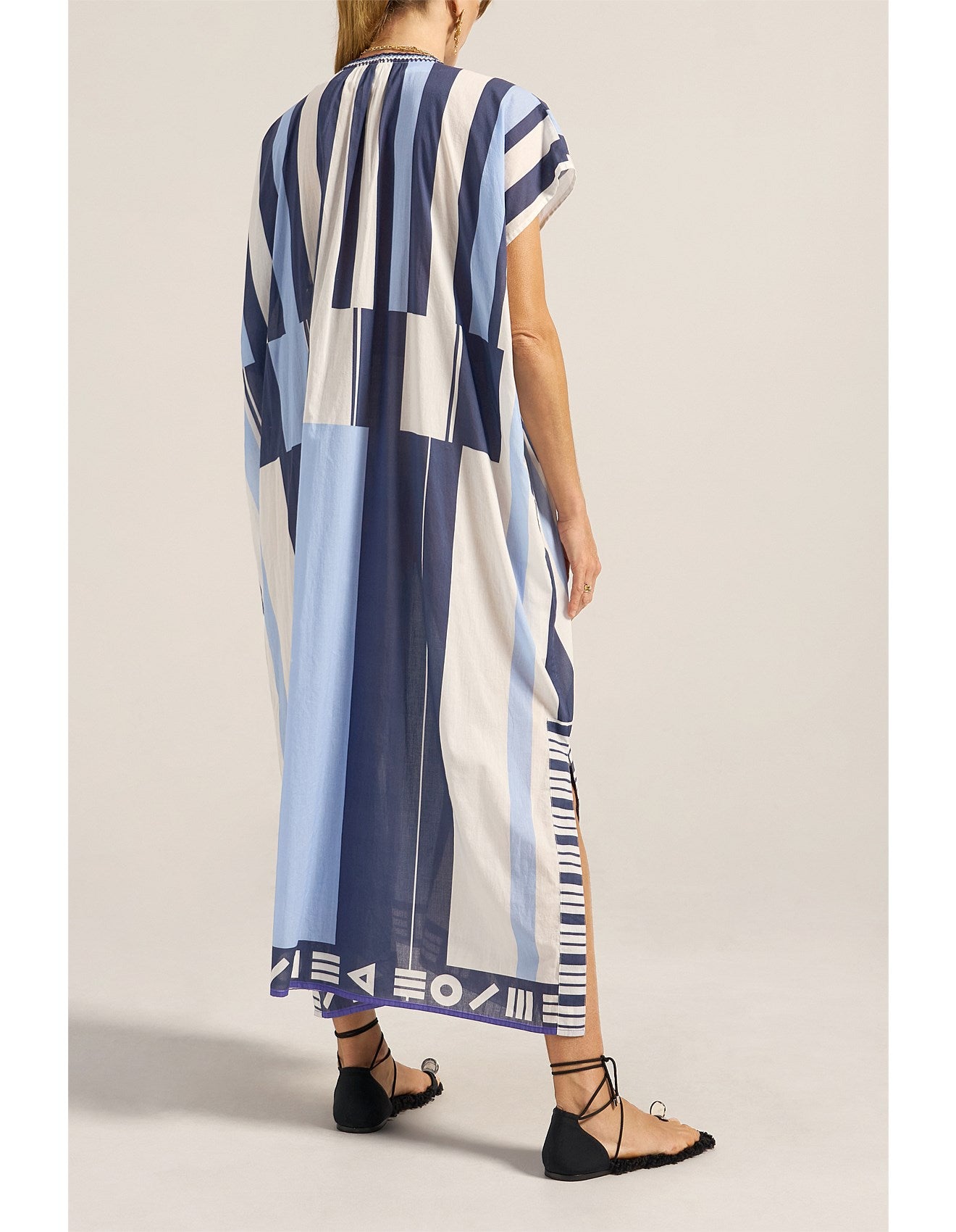 The Thaddeus Caftan is an oversized, relaxed silhouette crafted from our Blue Sarong Voile, a lightweight cotton in a cool mix of blue and white hues. It features a round neckline edged with delicate crochet, a V-neck drop with a tasseled tie closure, and gentle gathering at the base of the V for subtle shaping. Cap sleeves and side slits complete the flowing silhouette, making the Thaddeus Caftan an effortless piece for sun-drenched days or layered elegance at evening gatherings.