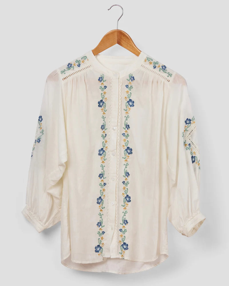 A beautiful embroidered blouse based on our Ines shape with a trellis embroidery of passionfruit flowers & leaves. Scallop lace trim around outer edges.